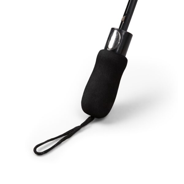 Reinforced with eight fiberglass ribs, the structure holds steady in wind, while a comfortable rubber handle and wrist strap make it easy to carry through commutes, travel, and everyday use. A matching sleeve and velcro tie wrap keep everything compact and organized between uses.