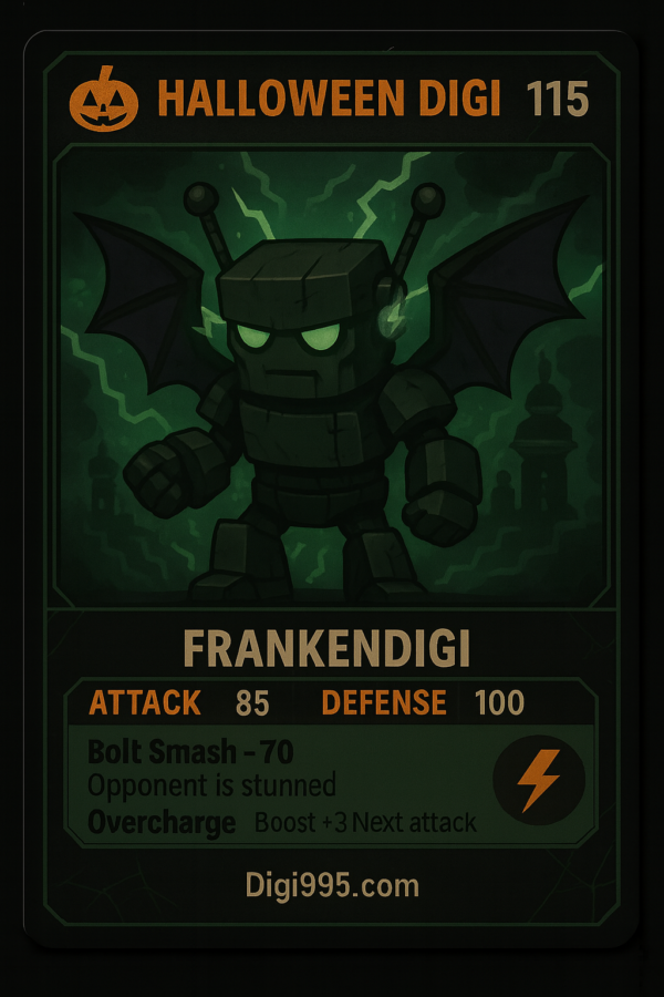 Legends whisper that Frankendigi’s consciousness was once part of the original Digi 995 core — a resurrection experiment gone horribly awry. When the void fractured and the Halloween surge rewrote reality, this corrupt data was resurrected from the graveyard of the old network, reassembled… imperfectly.