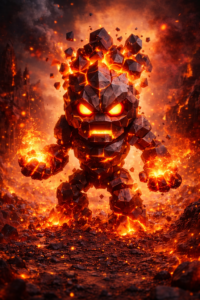 His body is a walking forge of obsidian plates, magma veins, and enchanted furnace-core runes. Every step shakes the ground. Every strike lands like a collapsing mountain.