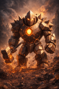 Yet when battle became unavoidable, Terros proved equally devastating — wielding a warhammer carved from the heart of Mount Kaldur and fighting with calculated precision guided by ancient war philosophies etched into his core memory.